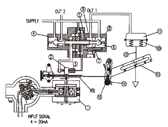 氣動閥門定位器是按力平衡原理工作的,實現(xiàn)由輸入的4~20mA電流信號控制氣動閥門由0~100%的開啟度。其工作原理如下圖。