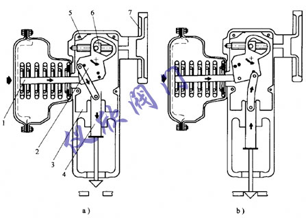 a)正作用———?dú)怅P(guān) b)反作用———?dú)忾_ 1—推桿! 2—搖板 3—連接板 4—連桿 5—絲杠 6—滑塊 7—手輪
